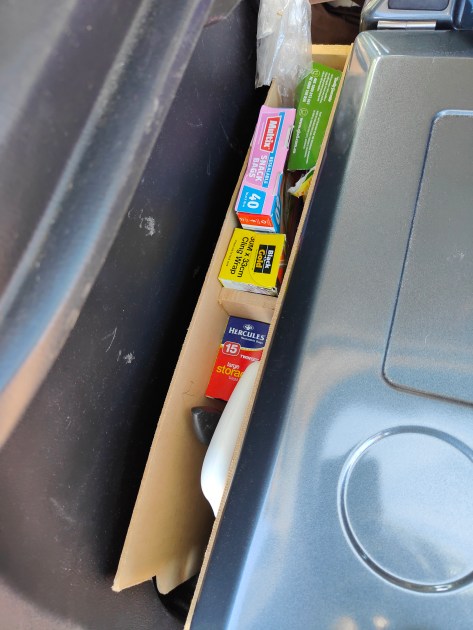 There’s enough space down he outside of the pantry box to put long skinny items such as the spare gas containers for the camping stoves, dog treats and collapsible water bowls, and my camp shower.